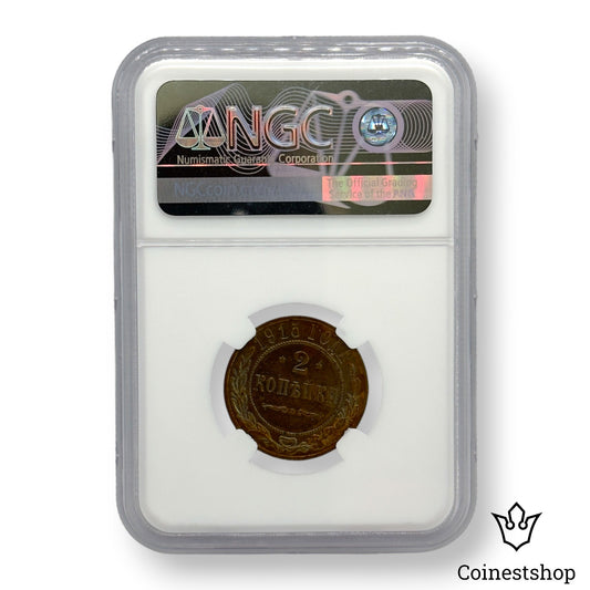 1914 CNB Russia NGC 2 Kopecks AU 58 BN Copper Coin Tsar Nicholas II